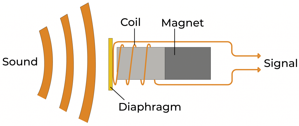 다이내믹 마이크는 소리가 떨리면서 다이어프램이라는 것을 움직여서 전기신호를 만들어 낸다.